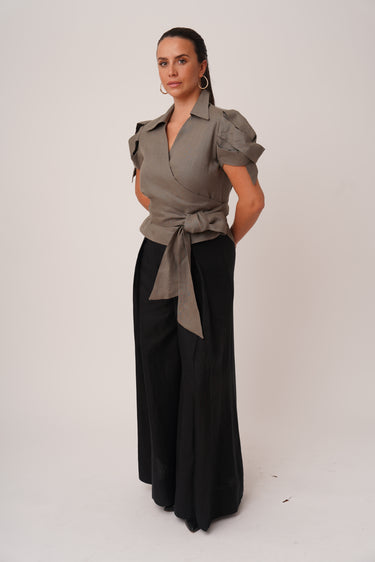 This stunning short sleeved, 100% Irish Linen shirt is adorned with hand- made cross over band detailing. A wrap over front, finished with an adjustable wide belt is an elegant way of enhancing the waistline. Create a statement for any occasion. Each Shirt is woven and made to order. Please allow 10-14 days for dispatch currently.